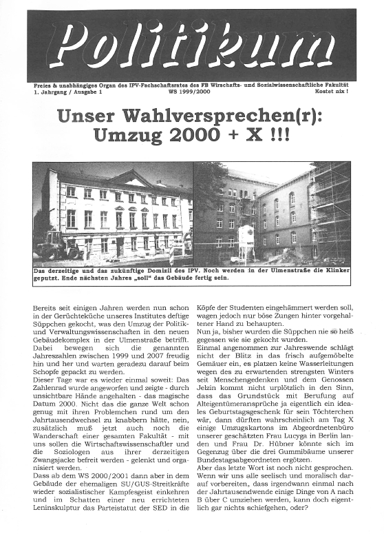 Bereits im Wintersemester 1999/2000 wurde das POLITIKUM als Zeitschrift der Studierenden am IPV von Christopher Roll ins Leben gerufen. Ab dem Folgesemester waren dann Andreas Hoffmann, Gunnar Peters und Robert Schulz Herausgeber der Zeitung, die damals unter dem Motto "Studium, Lehre, Leben am IPV" stand. Mittlerweile engagiert sich bereits die fünfte Studierendengeneration in der Redaktion und seit Jahren gewährt der ALUMNI-Verein finanzielle Unterstützung bei den Druckkosten. In seiner Sitzung vom 24.03.2014 beschloss der Vorstand die Studierendenzeitschrift nun auch administrativ unter die Arme zu greifen, so können sachgebundene Spenden mit dem Vermerk "POLITIKUM" nun auch auf das Vereinskonto überwiesen werden. Die Zeitschrift selbst erscheint zukünftig mit dem Vermerk "In Zusammenarbeit mit dem ALUMNI-Verein Rostocker Politikwissenschaft e.V.", wobei die POLITKUMsredaktion weiterhin verantwortlich im Sinne des Presserechts bleibt.